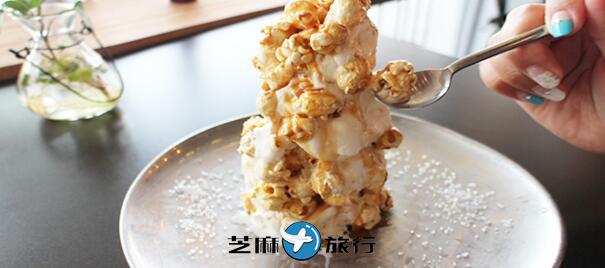 这里的爆米花海盐冰淇淋是将焦糖爆米花均匀拌入香草冰淇淋后,接着在冰冻的盘子洒上些许海盐沾着品尝的甜点。用盐增加一点咸味儿可以更好地感受冰淇淋的甜味儿,就像夏天用西瓜蘸着盐吃一样,是一种令人上瘾的味道。